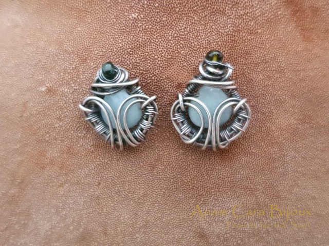 Deze 2 cm hoge steekoorbel is van silverfilled draad waar een Toermalijn en een kleine Amazonietsteen zijn ingeweven. (no13)